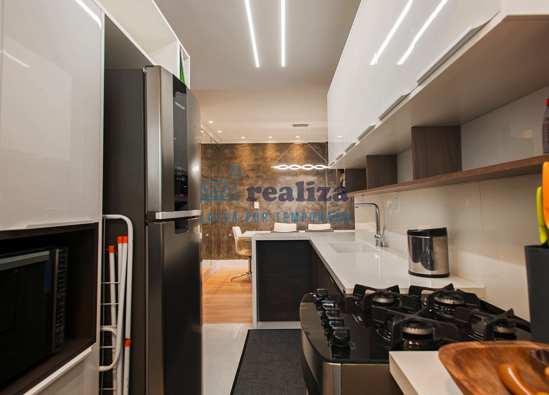 Apartamento decorado com cozinha completa, churrasqueira, internet, sala de jantar, cafeteira, forno, fogão, geladeira e microondas.