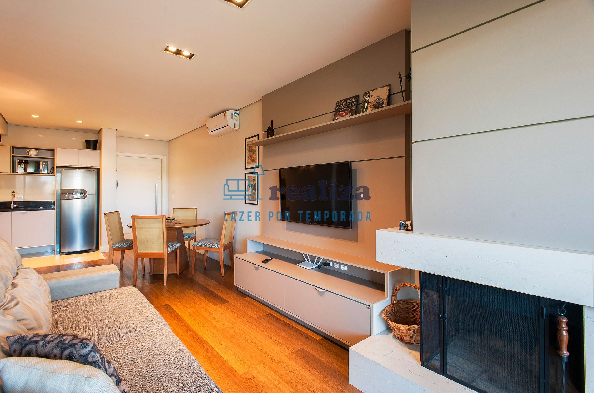 A sala de estar é integrada à cozinha, possui Smart TV, ar condicionado (quente/frio) e uma aconchegante lareira. O apartamento conta com uma ampla varanda com churrasqueira e vista para a cidade.