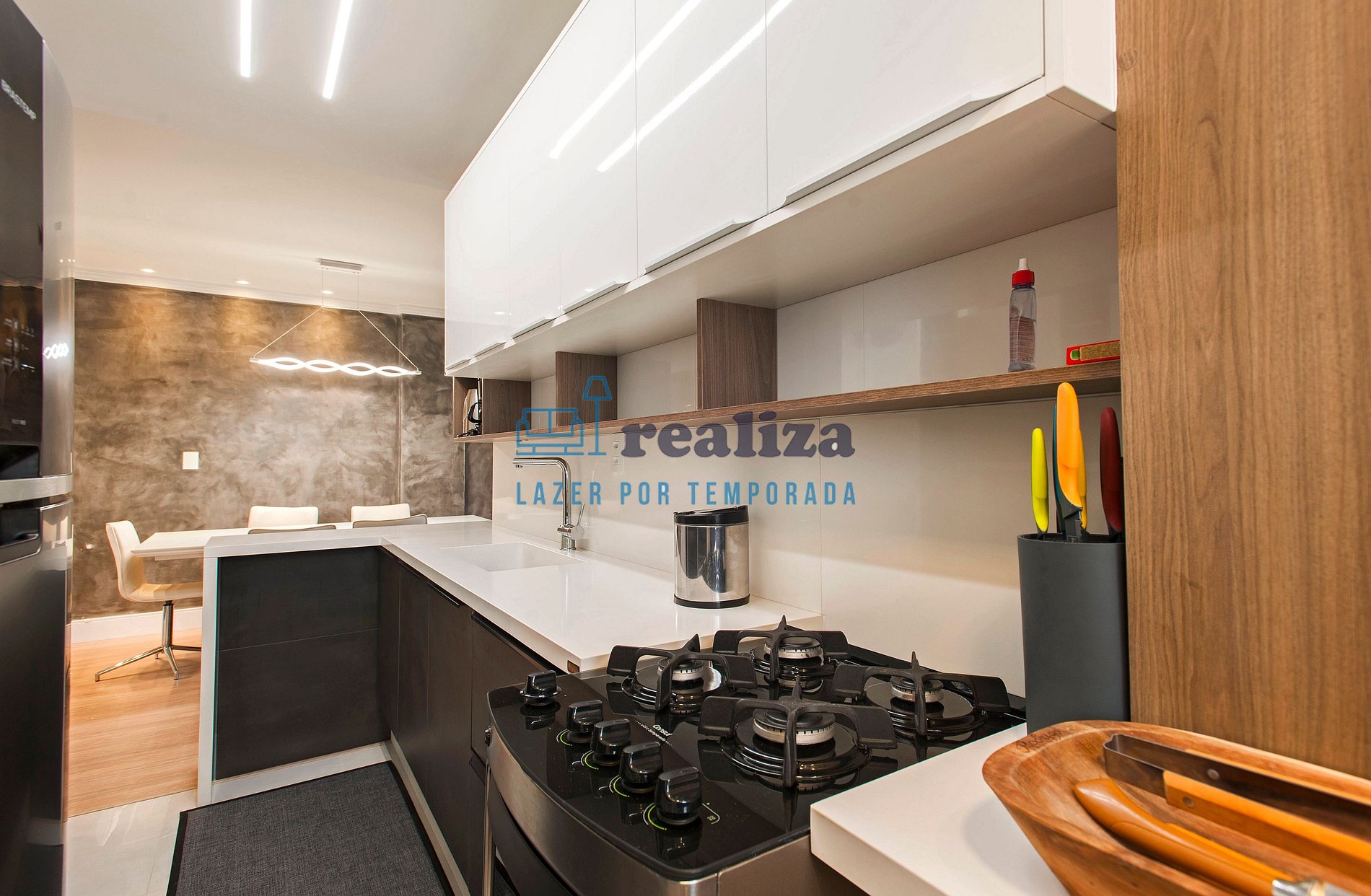 Apartamento decorado com cozinha completa, churrasqueira, internet, sala de jantar, cafeteira, forno, fogão, geladeira e microondas.