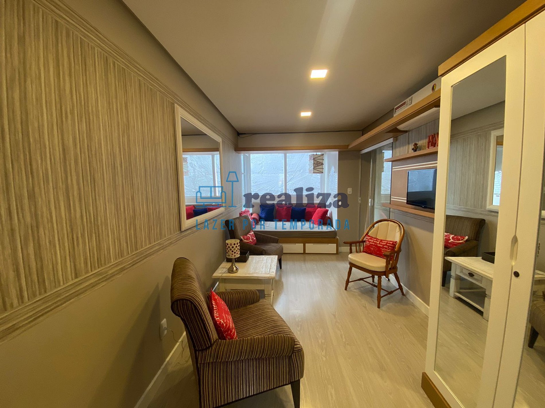 Possui um quarto com uma cama de casal mais um sofá cama na sala de estar. Acomoda confortavelmente até 4 hóspedes.